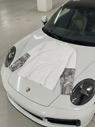 Camouflage reimagined. Oversized long-sleeve tee in premium 100% heavyweight cotton with custom Realtree camo sleeves — iconic tree-bark pattern in muted grey bleeding into clean white body for perfect street-camo contrast. Dropped shoulders, wide sleeves, ribbed crew neck, and garment-dyed wash deliver instant vintage feel with subtle outdoor-luxury edge. Built for layering or low-key flex.