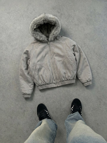 Arctic armor for the streets. This cropped bomber-style jacket is built from heavy-duty washed cotton with a plush faux-fur lined hood, elastic cuffs & hem, full zip closure, and signature raglan sleeves for that oversized, relaxed fit. The muted grey wash gives it instant vintage character while the fur hood adds raw winter-ready luxury. Perfect for layering over hoodies or rocking solo when the temperature drops.