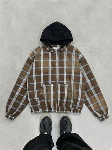 Street-forged armor. This cropped bomber is built from heavy washed cotton with classic quilted stitching, full zip, elastic cuffs/hem, and plush faux-fur lined hood for raw winter utility. The earthy plaid pattern in muted brown tones adds heritage depth while the oversized fit, raglan sleeves, and metal snaps deliver modern proportions and effortless layering power.