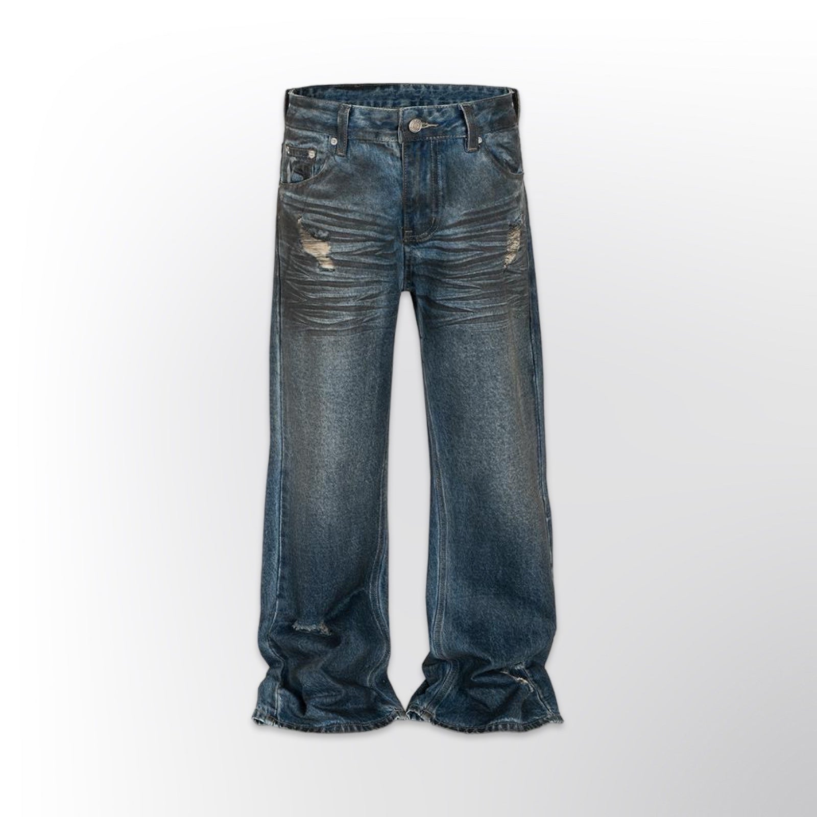 • Key Style: Dark-wash, distressed denim with cosmic rip detailing.