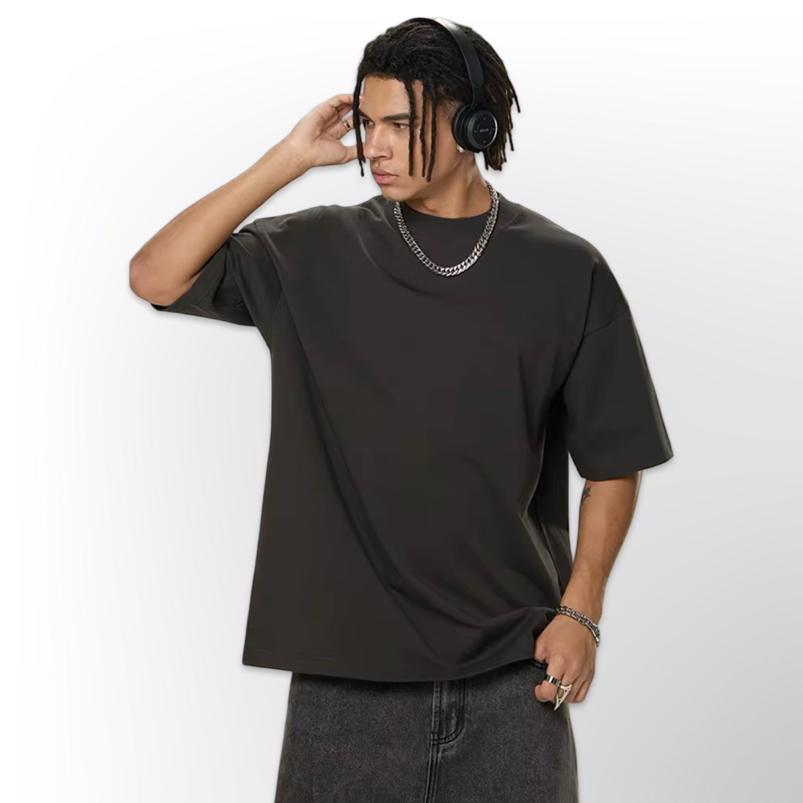 • Oversized boxy silhouette — generous cut with dropped shoulders and wide short sleeves for maximum presence
