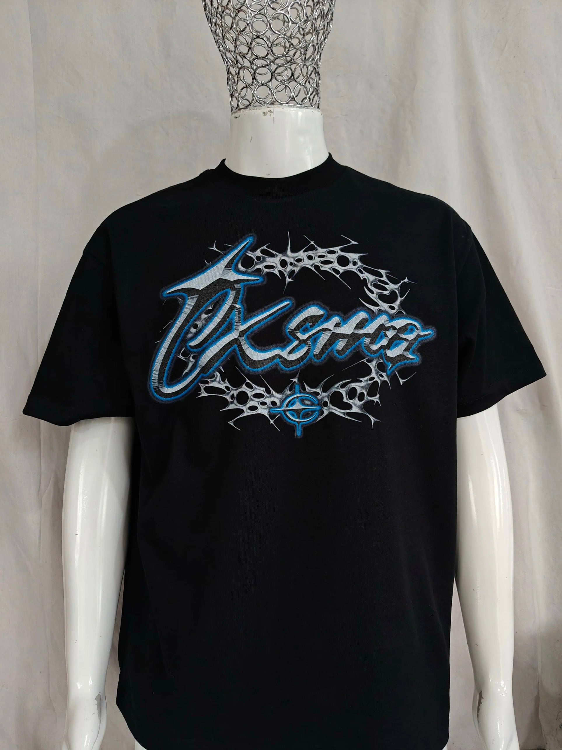 Aggressive Design: CXSMO logo wrapped in barbed wire, radiating a metallic blue glow.