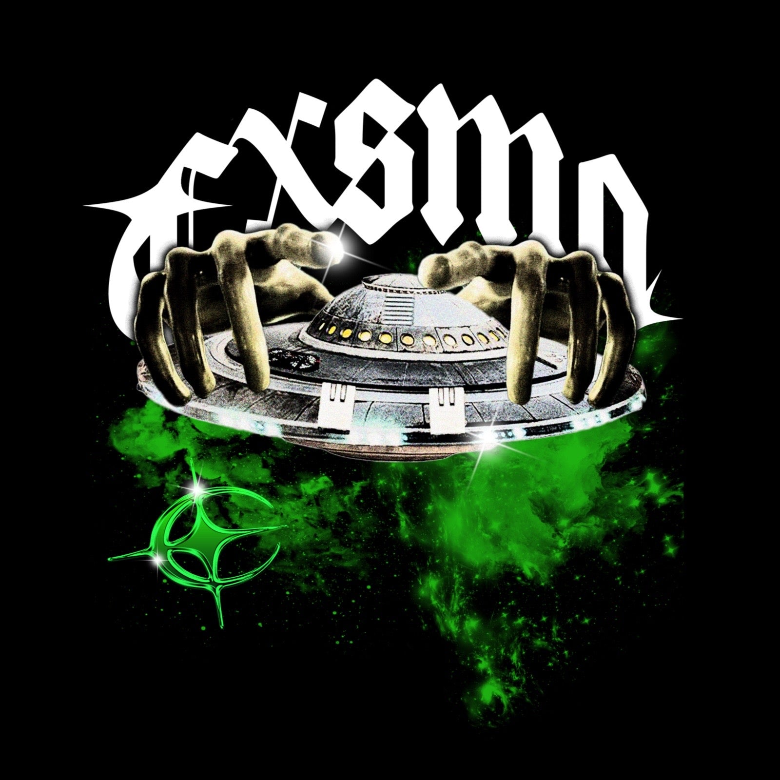 Futuristic Graphic: Features an alien hand gripping a UFO, surrounded by green smoke.